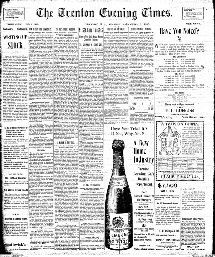This week is focused on the week of 1896 from The Trenton Evening Times. The Top Headlines were Writing Up Stock, Decomrates at Indianapolis, At Sea Girt Ranges: Hih Win Prevents Making Any High Score, Trenton Evening Schools, and A Street Committee Meeting where “Contractor Fell Protests the Award of the Prospect Street Paving.