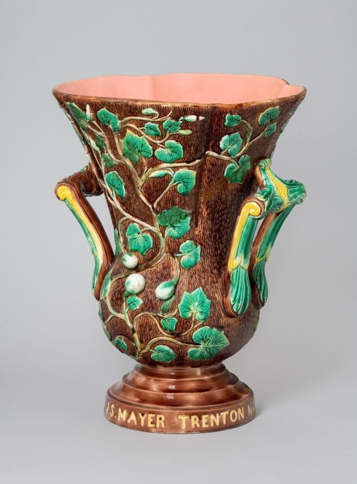 Introduced in 1851 by the renowned English firm, Minton & Co., and subsequently made by dozens of other Staffordshire factories, the eccentric designs, boldly molded forms, and richly colored glazes of majolica captured the attention of consumers on both sides of the Atlantic—the potteries of Trenton, New Jersey, responded accordingly.