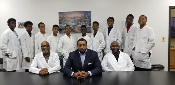 A cohort of young leaders from Trenton 9th Grade Academy met for the first time in a classroom setting for a program orientation, to get fitted for their lab jackets, and to take a group photo with UIH Family Partners Associate Executive Director, Duncan Harrison.