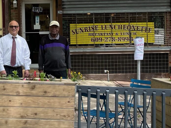 Sunrise Luncheonette, located at 26 South Warren St. is the first business of the season to see their parklet up and running. Mayor W. Reed Gusciora and Aide to the mayor, Shakespearecia Cadet, stopped by on Wednesday, June 2 to witness the installation.