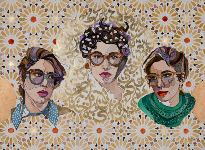 Alia Bensliman: My maiden name, Ktari, means “from El Ktar,” an indigenous Amazigh town in the mountainous southwest of Tunisia. I first encountered Amazigh pottery on a class field trip as a child. I fell in love with its intricate patterning and rich colors. My paintings in Reciting Women draw on both Amazigh and Islamic patterns. Making this work during the pandemic – when I was isolated from my community and far from where I grew up – helped keep me connected to my culture and my roots.