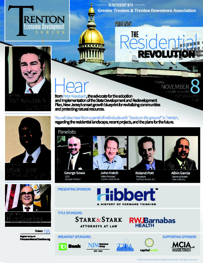 On Friday, November 8th at 7:30 a.m., the Princeton Mercer Regional Chamber will hold its Trenton Economic Development Series in partnership with Greater Trenton & Trenton Downtown Association. “The Residential Revolution,” happening at Trenton Country Club, will feature a keynote address from Peter Kasabach of New Jersey Future, the advocate for the adoption and implementation of the State Development and Redevelopment Plan, New Jersey’s smart growth blueprint for revitalizing communities and protecting natural resources.